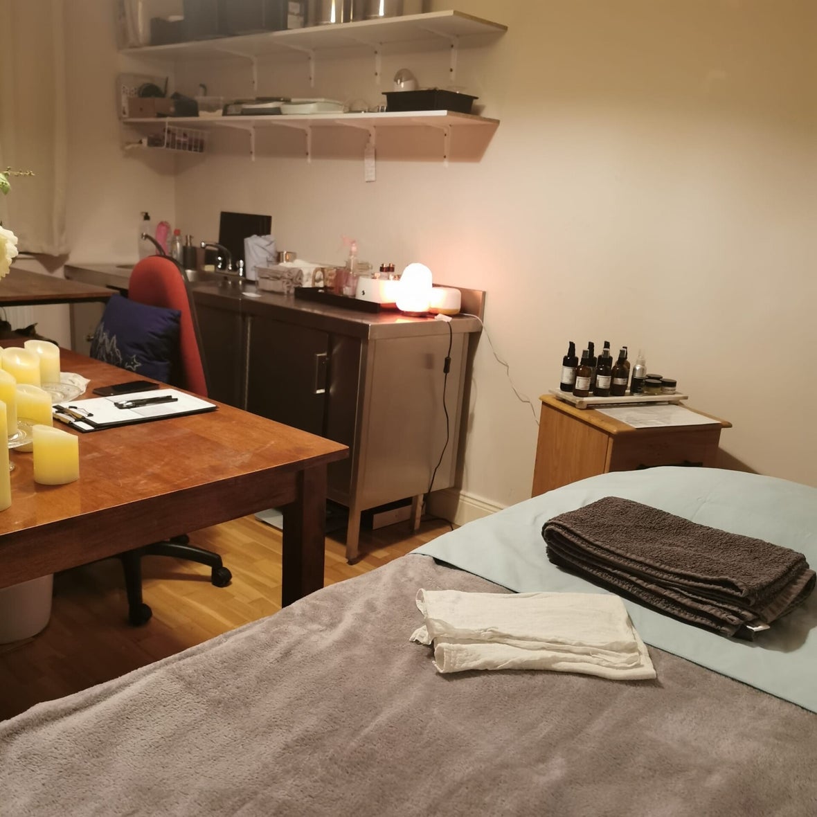 Image No3. How I started. My consultation area with storage shelf covered with curtains behind the table.