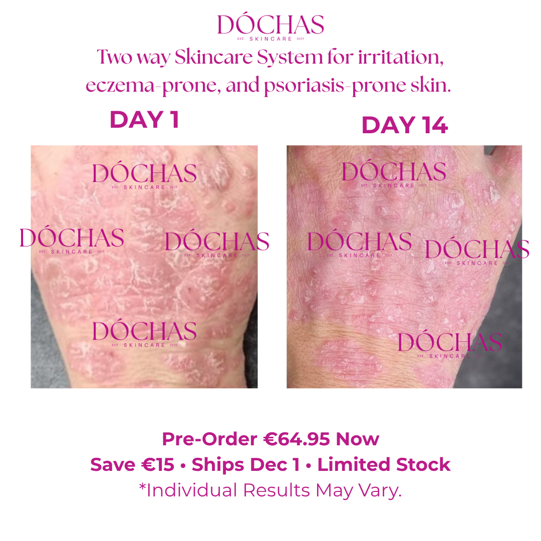 The DÓCHAS Relief & Repair System™ is a two-step skincare ritual created by a Certified Organic Skincare Formulator, combining nature’s most soothing actives to help support your skin’s natural balance and barrier health.